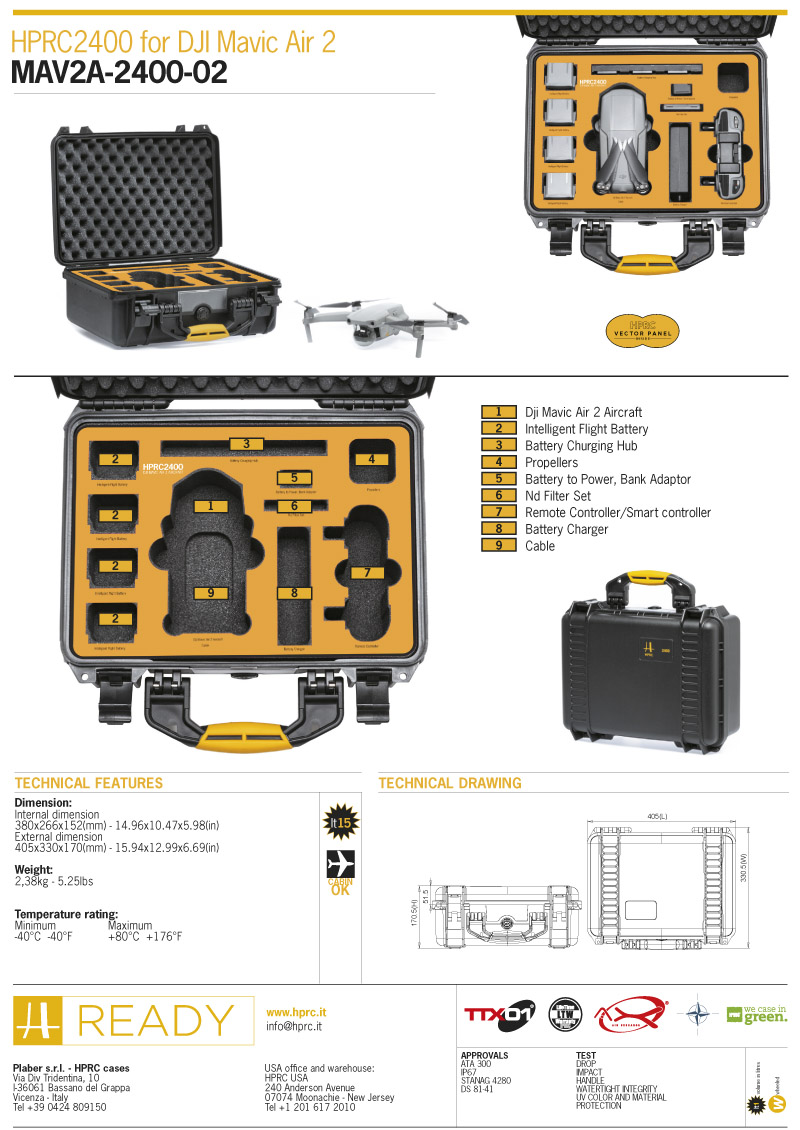 La maleta HPRC2400 está diseñada específicamente para transportar y proteger tu DJI Mavic Air 2 y todos sus accesorios esenciales. Con un sistema de organización eficiente y protección de alta calidad, tu equipo estará seguro y listo para cualquier aventura.