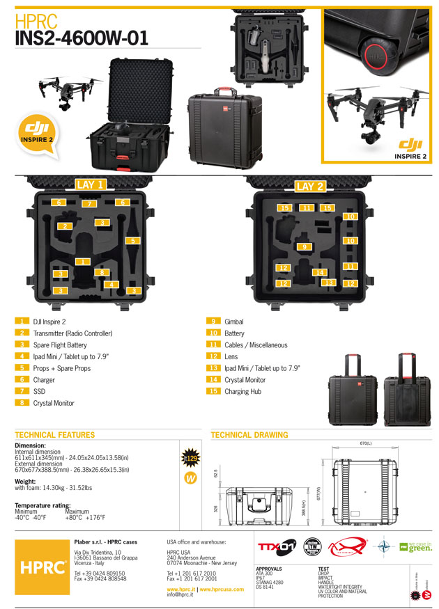 Maleta HPRC INS2-4600W-01 con ruedas y esponja preformada para drone DJI Inspire 2. Esta maleta es rígida y resiste golpes, caídas, corrosión, temeperatura extremas... Està dotada de una junta de neopreno que garantiza la total impermeabilidad del interior (cierre estanco) aunque se esté sumergidos en aguas poco profundas. La válvula de control de presión automática iguala la presión del aire cuando se viaja a diferentes alturas.
