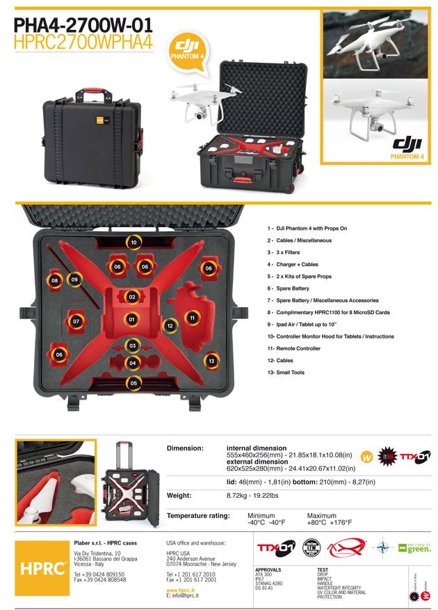 Esta maleta con ruedas y estanca está basada en el modelo HPRC2700W - diseñada para transportar el Phantom 4 / Phantom 4 Pro / Phantom 4 Pro+ en total seguridad y sin la necesidad de desmontar las hélices.