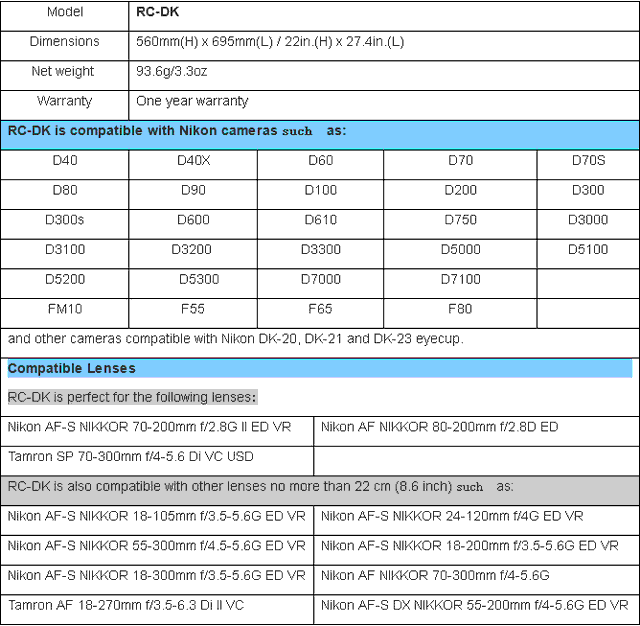 Funda JJC RC Serie lluvia , compatible con Nikon réflex digitales con objetivos cuya longitud no sea más de 22 cm. Esta capa de lluvia está hecha de materiales de alta calidad y puede proteger la cámara de la lluvia, el polvo y el barro con eficacia. La ventana transparente incorporado hace que la parte superior y el monitor de su cámara sean visibles y también le da acceso completo a los controles de la cámara. Con el diseño de velcro, el tamaño de la capa de lluvia se puede ajustar el tamaño de la cámara. Mientras tanto, la manga del brazo le permite meter la mano y controlar la cámara. También se puede montar en trÃpode. Además, esta capa de lluvia viene con un bolsillo integrado inteligentemente diseñado que se utiliza para almacenar la ojera y otras cosas. Destacados - Protejes de lluvia, polvo y barro - La parte transparente hace visible la pantalla de la cámara - El acceso a los controles - Montaje en Tripode