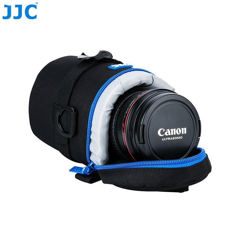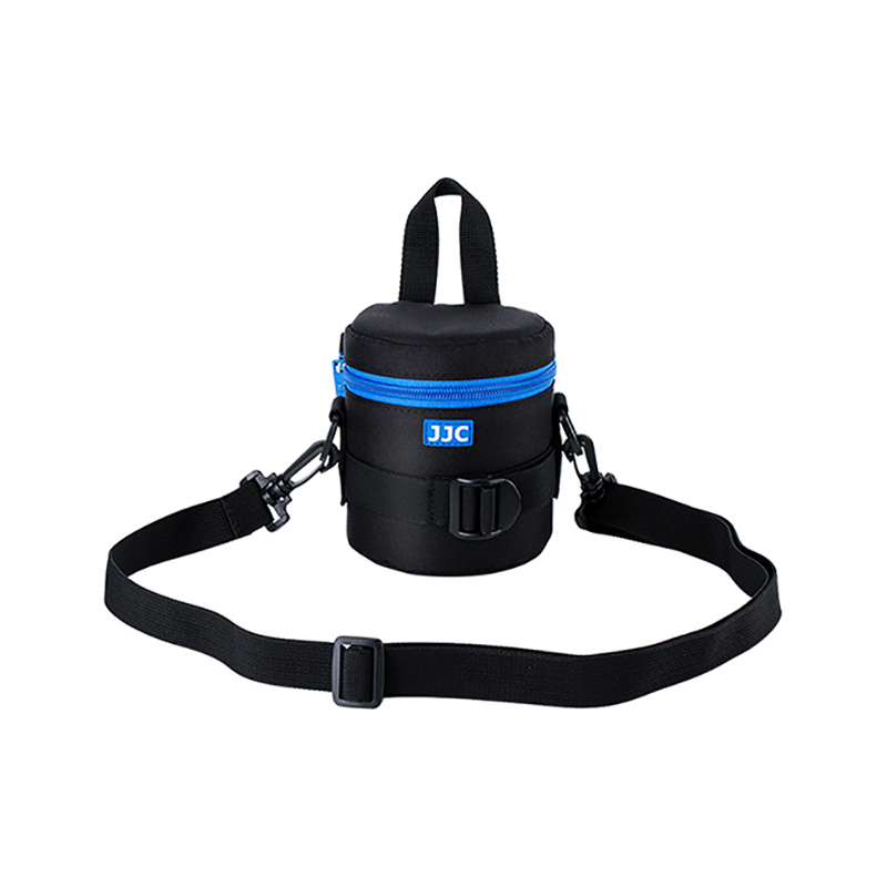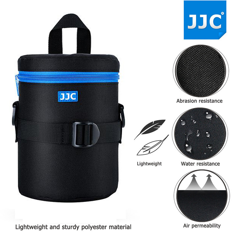 JJC Deluxe Lens Pouch está hecha de poliéster resistente con un interior de espuma de cojÃn que proporciona una gran protección y absorción de impactos para la lente. El material exterior es resistente al agua para proteger el contenido de la lluvia y la humedad. Tiene una cremallera de dos vÃas azul oscuro con un bolsillo accesorio de malla en la tapa. La cremallera tiene pequeños bucles que permiten el bloqueo con un pequeño candado. Puede colocar el accesorio pequeño, como la tapa del objetivo o el control remoto, en el bolsillo interior. Cuenta con 4 opciones de transporte: 2 anillos en D con una correa para usar como correa para el hombro, 2 presillas con ojales para una correa para el hombro, trabilla para ser enganchada en el cinturón y asa en la parte superior para llevarla en la mano con mayor comodidad.