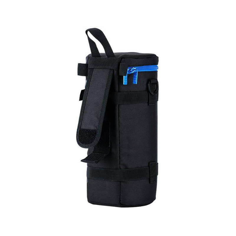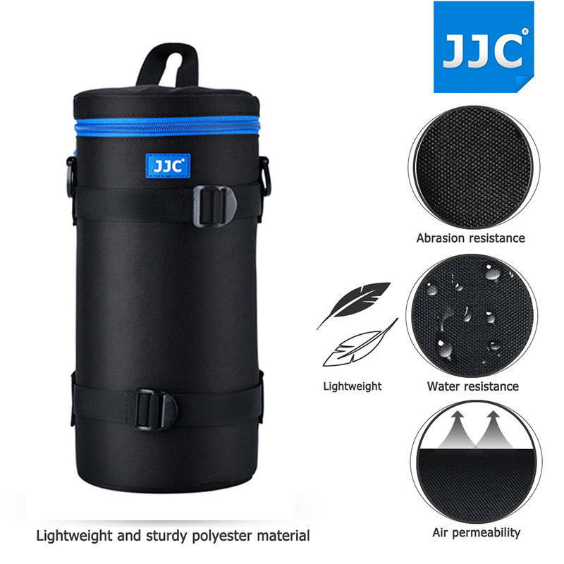 JJC Deluxe Lens Pouch está hecha de poliéster resistente con un interior de espuma de cojÃn que proporciona una gran protección y absorción de impactos para la lente. El material exterior es resistente al agua para proteger el contenido de la lluvia y la humedad. Tiene una cremallera de dos vÃas azul oscuro con un bolsillo accesorio de malla en la tapa. La cremallera tiene pequeños bucles que permiten el bloqueo con un pequeño candado. Puede colocar el accesorio pequeño, como la tapa del objetivo o el control remoto, en el bolsillo interior. Cuenta con 4 opciones de transporte: 2 anillos en D con una correa para usar como correa para el hombro, 2 presillas con ojales para una correa para el hombro, trabilla para ser enganchada en el cinturón y asa en la parte superior para llevarla en la manocon mayor comodidad.
