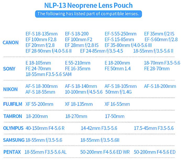 La funda NeoPrene Lens Pouch (NLP) ha sido diseñada para almacenar y transportar un objetivo de cámara. Esta funda cuenta con un práctico cordón de cierre que a su vez permite un rápido acceso al objetivo. Fabricado en neopreno de gran suavidad, esta funda proporciona una gran protección y absorción de impactos. Su mosquetón lateral para sujección permite un cómodo transporte. Las fundas NLP de JJC están disponibles en una amplia variedad de tamaños.