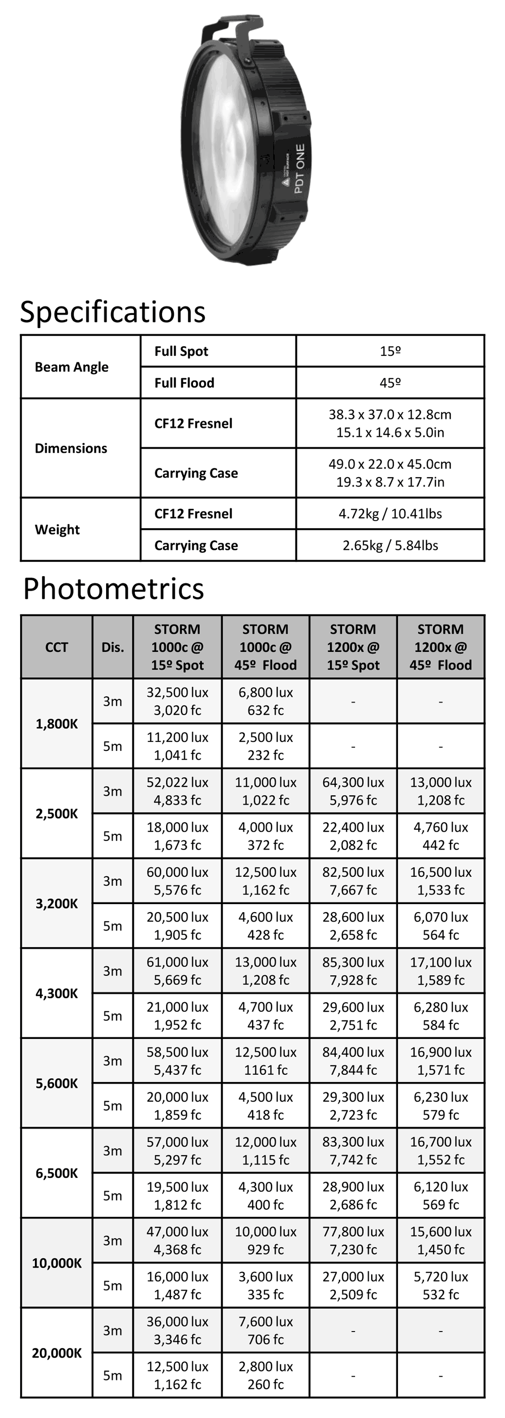 El CF12 Fresnel puede combinarse con las puertas de lente CF12 (CF12 Barn Doors), disponibles por separado, para brindar a los usuarios un control aún mayor sobre la salida de luz de sus modelos STORM 1000c o 1200x. Para mayor comodidad, el CF12 Fresnel y las puertas de lente CF12, también disponibles por separado, caben en las maletas rodantes de los modelos STORM 1000c y 1200x con el accesorio ya colocado en el estuche.