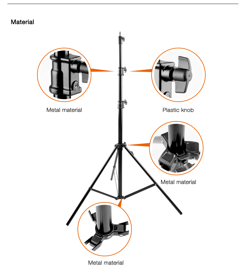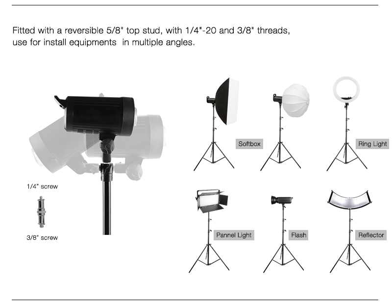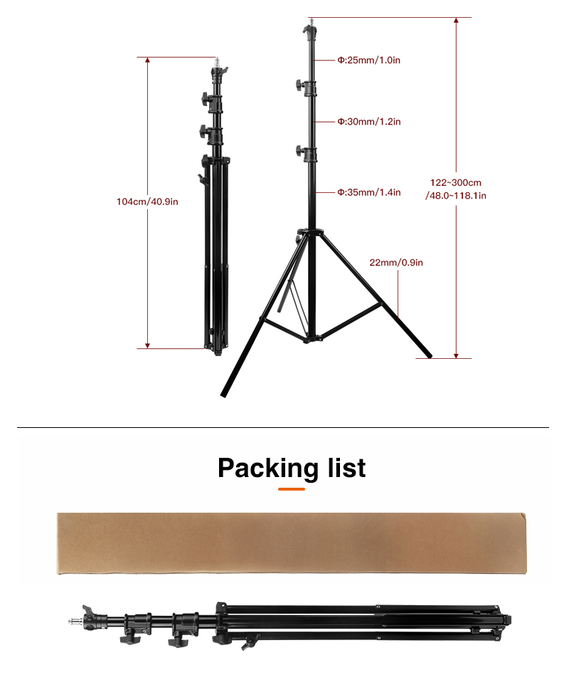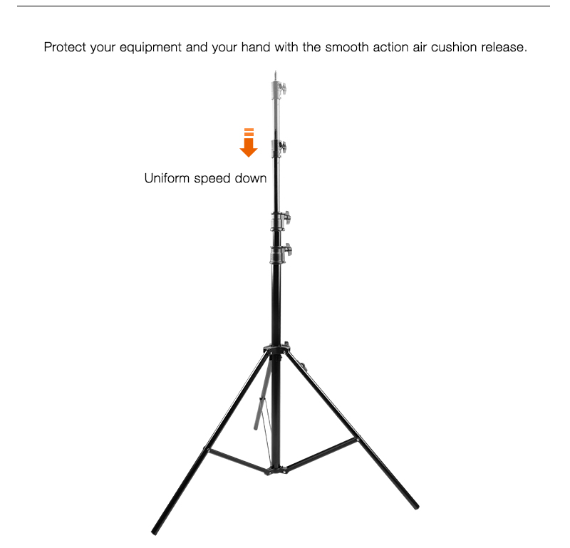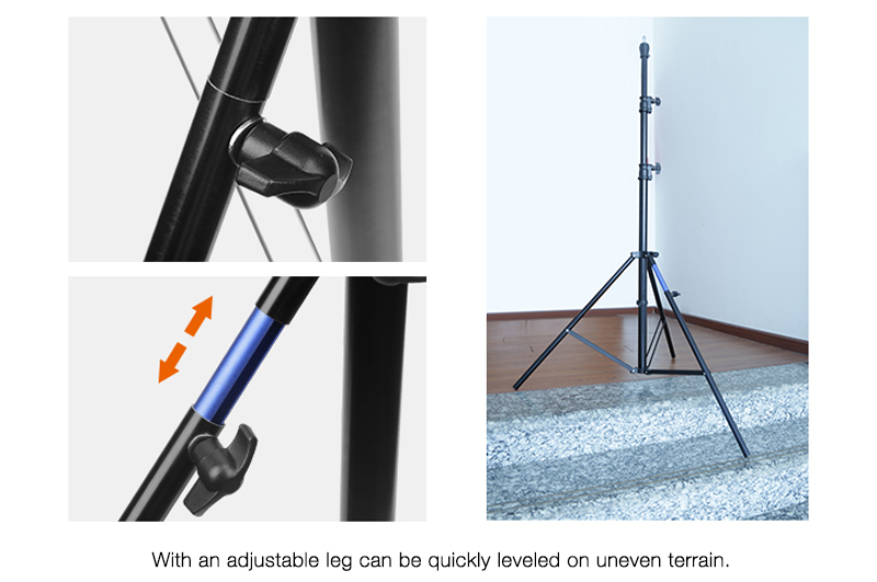 El E-IMAGE LS-PRO30A es un resistente soporte de luz de aluminio de 3 secciones que soporta cargas de hasta 6 kg. El soporte cuenta con un perno superior desmontable con roscas macho de 1/4-20 y 3/8-16 para cubrir todas las necesidades de montaje. Se eleva a una altura máxima de 118.1 pulgadas (3 metros) y tiene una pata ajustable que se puede nivelar rápidamente en terrenos irregulares. Es perfecto para sostener luces LED u otros accesorios.