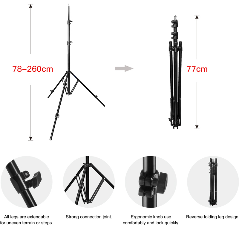 El soporte de iluminación E-IMAGE LS03, con un diseño de patas plegables en reversa, permite que las patas se desplieguen rápidamente para su uso y se plieguen hacia arriba contra la sección central. Puede soportar hasta 5 kg en su extensión máxima.