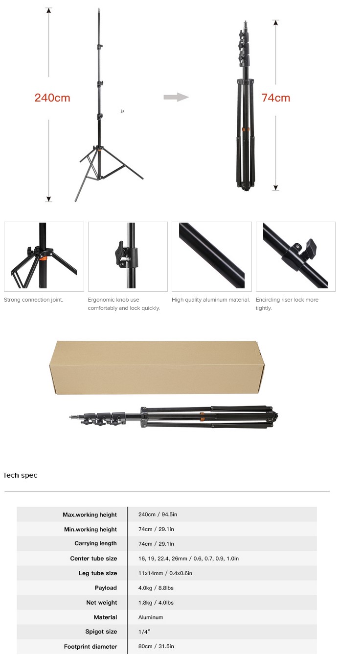 El soporte de iluminación plegable E-IMAGE LS04, con diseño ligero y plegado en reversa, está fabricado en aluminio de alta calidad con un acabado de superficie preciso. La altura es ajustable de 74 cm a 240 cm y cuenta con capacidades de bloqueo y desbloqueo rápido. Tiene una rosca de 1/4" en la parte superior, compatible con numerosos accesorios de iluminación.