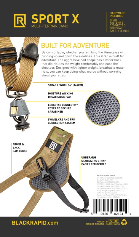 Diseñada para llevarse sobre el hombro izquierdo, la cámara queda siempre lista en la cadera derecha. Se puede usar con objetivos largos o cortos y con cámaras DSLR o sin espejo; la amplia y robusta almohadilla de la Sport X se adapta cómodamente al hombro distribuyendo de forma uniforme el peso de tu equipo. Fabricada con materiales ligeros y el hardware resistente patentado de BlackRapid, te permite seguir haciendo lo tuyo sin preocuparte por la correa. Confía en BlackRapid: ¡la bandolera original para cámaras!