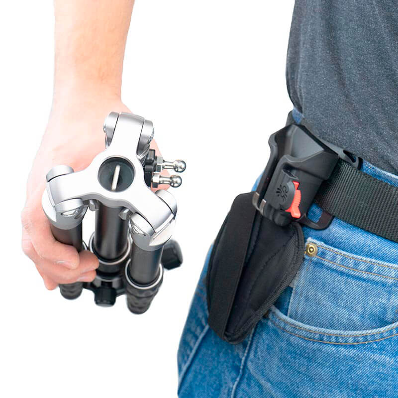 El Tripod Carrier de Spider ha sido diseñado para poder transportar cualquier trípode o monopié de hasta 2.26kg (5lbs). Fijado a una pata del trípode mediante dos bridas de alta resistencia, el bajo perfil del Tripod Carrier de Spider no interfiere con su uso del trípode.