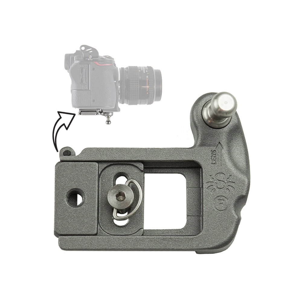 El soporte Spider X cuenta con un diseño de auto-bloqueo. La geometría del soporte y la placa impiden que la cámara se deslice hacia arriba y salga accidentalmente del soporte.