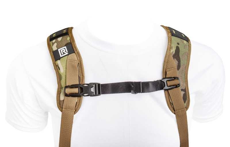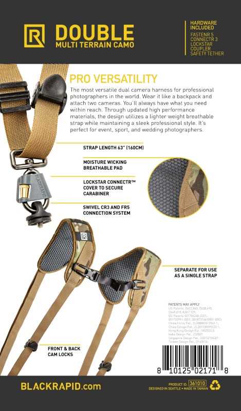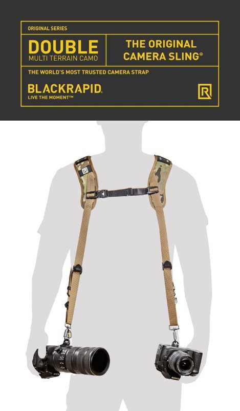 Arnés de cámara doble BlackRapid, camuflaje multiterreno, diseño de correa confiable para 1 o 2 cámaras SLR, DSLR o sin espejo.