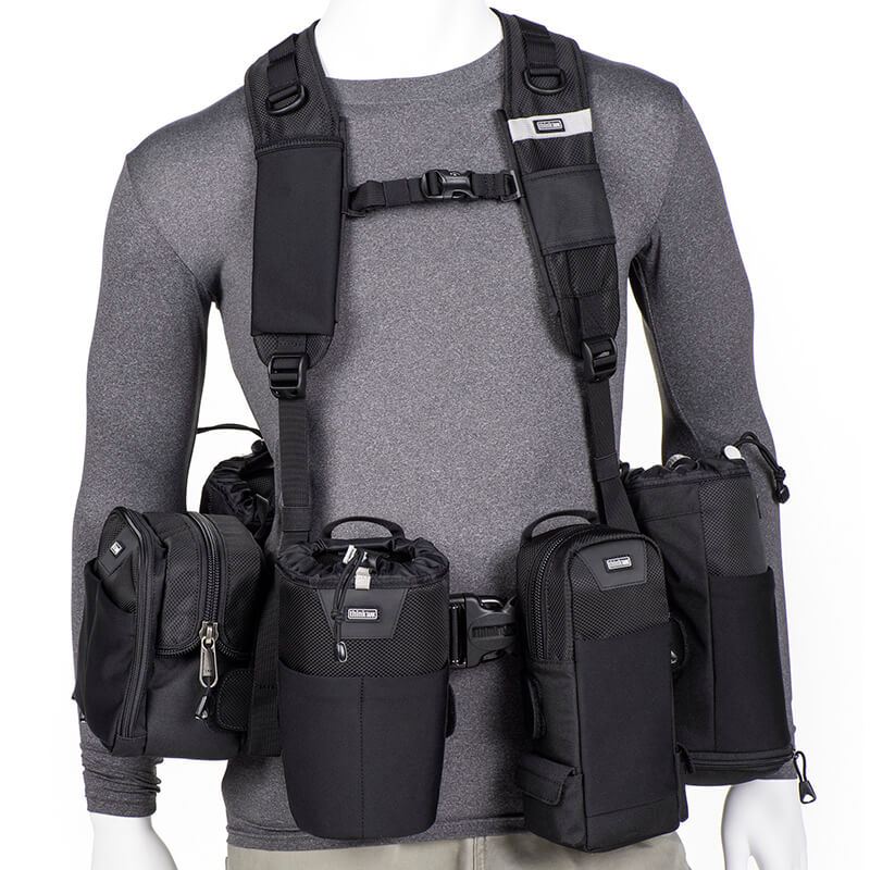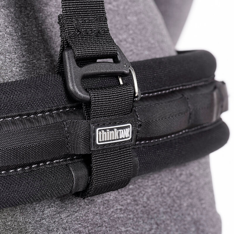 - Compatible con cualquier cinturón Think Tank (se vende por separado) para distribuir el peso entre los hombros y la cintura