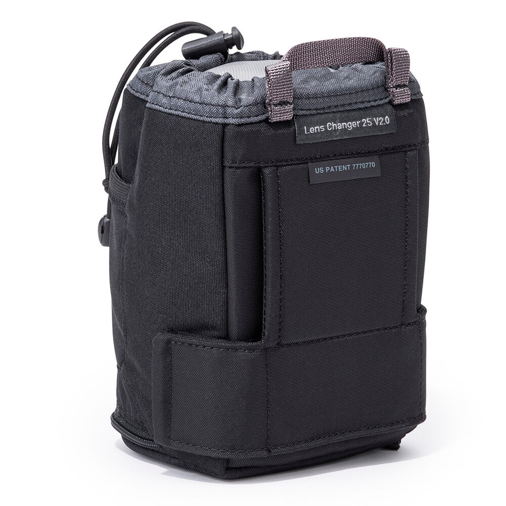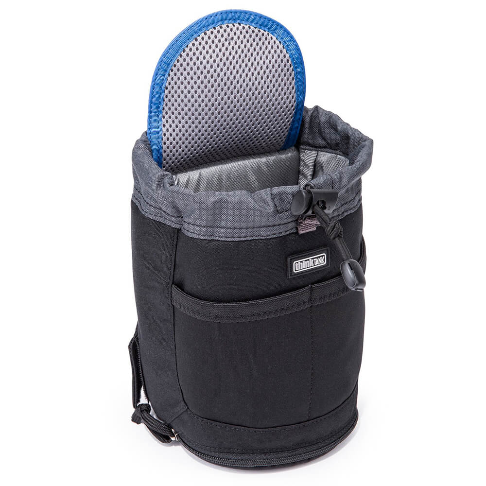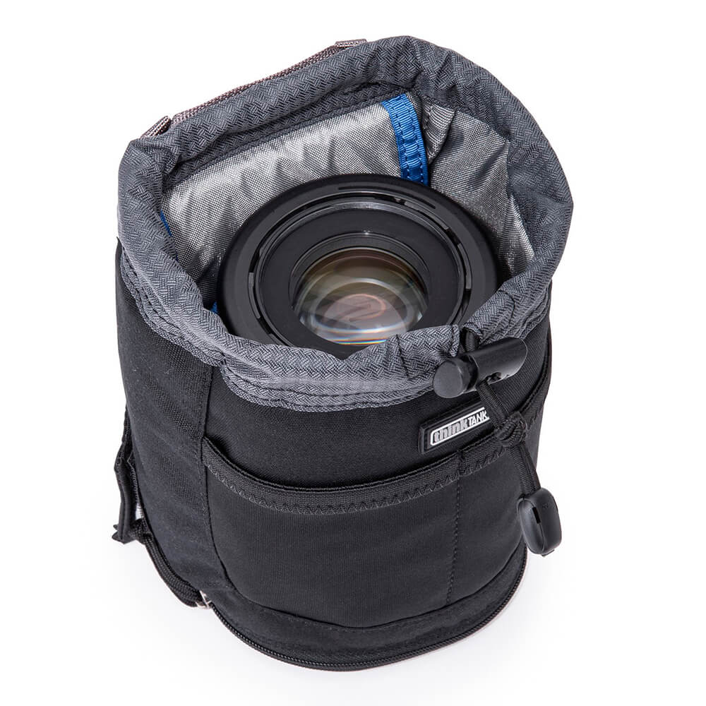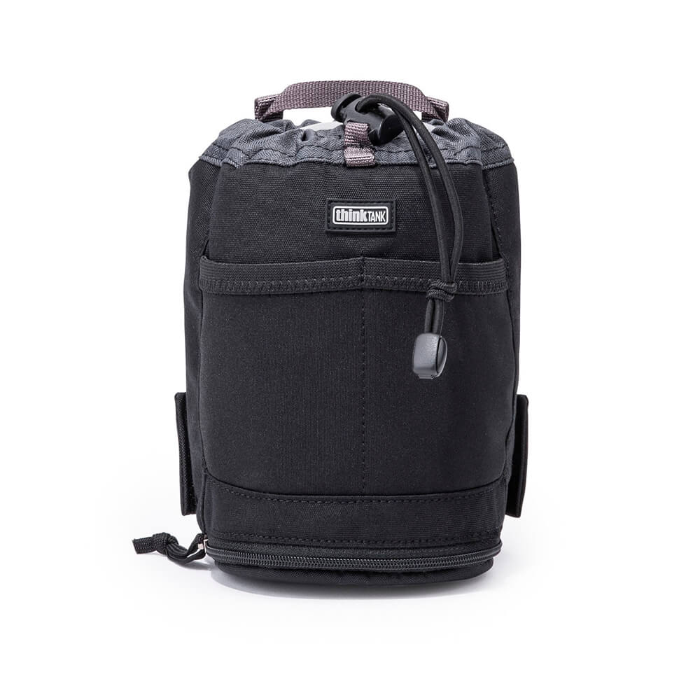 Bolsa de objetivo pensada para el sistema de cinturón modular Think Tank para lentes zoom medianas o pequeñas, objetivos principales de tamaño mediano con la capucha en posición de disparo