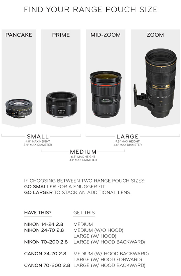 Ideal para llevar una lente (o dos), flash, micrófono, drone, cinta métrica u otro tipo de accesorios, la Range Bolsa mantiene le material seguro, protegido y accesible al instante, caracterizada por un diseño de estética limpia y práctica. Apertura expansible con cierre de gancho y bucle unidireccional y silencioso que facilita un acceso rápido al equipo. El relleno de felpa de gran calidad protege y se pliega para permitir el apilado de múltiples lentes o artículos más pequeños. Los puntos de anclaje permiten llevar la bolsa con cualquier correa de diseño de pico. Disponible en 3 tamaños: - Pequeños (primer y kit pequeño lentes) - Medio (kit grande y lentes de zoom medio, o 2 primeros) - Grandes (teleobjetivos o 2 lentes más pequeñas, o un DJI Mavic drone)