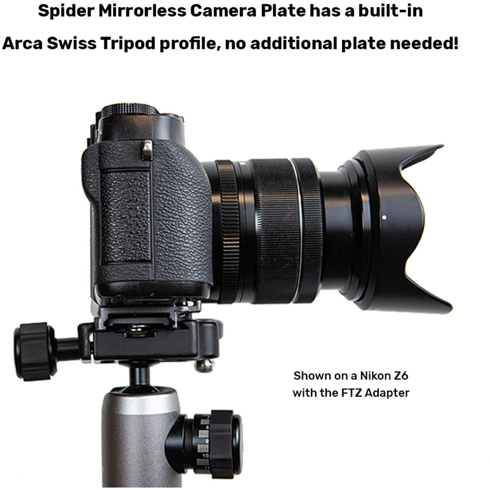 Ligera y duradera, la placa Spider para cámaras sin espejo está diseñada para cuerpos mirrorless. Su diseño deslizante se adapta a la mayoría de cámaras sin bloquear la puerta de la batería. Se fija a la rosca de trípode estándar de 1/4"x20 y cuenta con almohadillas antideslizantes para una sujeción estable y segura, además de un pin Spider antitorsión para mayor seguridad. Esta placa es compatible con trípodes estilo Arca-Swiss, actuando como adaptador. También puede usarse con otros tipos de adaptadores de trípode.
