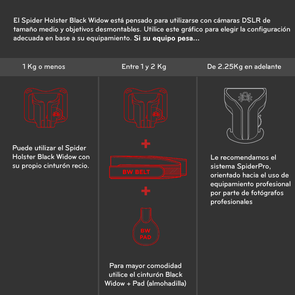 Todo lo que necesita, en una caja. Nuestro Spider Black Widow Holster Kit incluye todo lo necesario para su comodidad. El kit incluye 1 Black widow Holster, 1 Cinturón , 1 Pad y 1 Pin. Olvídese de tener que llevar la cámara colgada al cuello o en su hombro Por fin podrá centrarse en el placer de la fotografía sin las molestias de llevar la cámara colgando o de las correas retorcidas! Se acabaron los problemas con las correas al inclinarnos o agacharnos. Libertad en ambas manos y en la parte superior del cuerpo. Amplíe su disfrute y su versatilidad al fotografiar... lleve su cámara a cualquier parte con el Spider Holster Black Widow. Sus manos quedarán libres cuando lo necesite, permitiéndole realizar todo tipo de actividades: senderismo, visitas turísticas, moverse a través de una multitud de personas no podría ser más fácil! Seguridad integrada Cada vez que colocamos la cámara en el sistema Black Widow esta se queda bloqueada en su posición hasta que giremos la palanca de bloqueo manualmente. Esto proporciona la máxima seguridad en situaciones de sesiones especialmente activas así como como un impedimento para posibles intentos de robo.