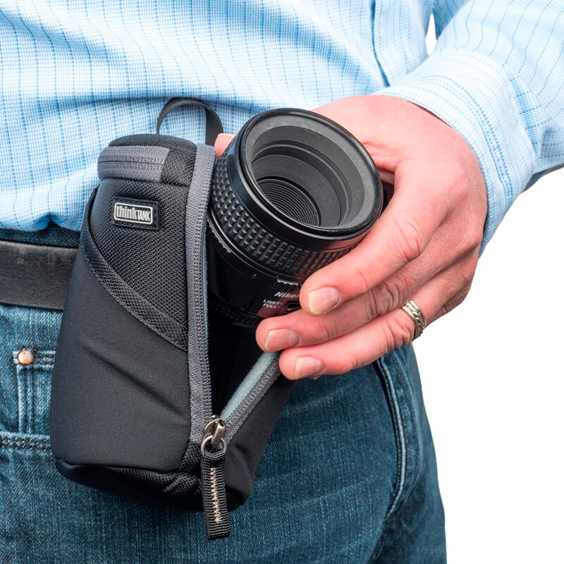 Funda para lentes con apertura dual que permiten acceso rápido al equipo gracias al acceso facilitado. Se puede transportar en una bolsa o enganchado en un cinturón. Los dos bolsillos elásticos externos proporcionan espacio para una tapa de lente o un paño de limpieza.