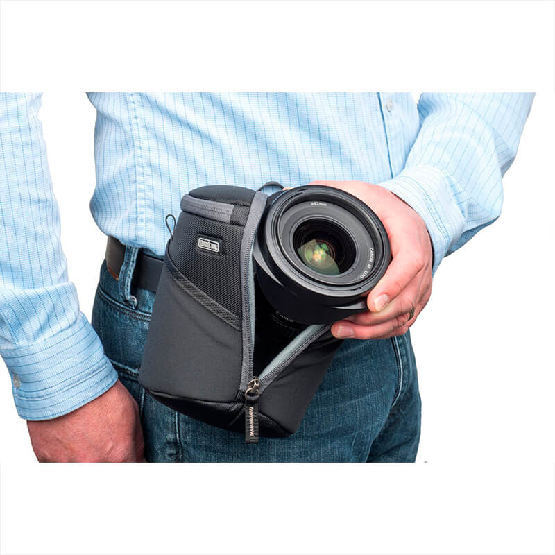Funda para lentes con apertura dual que permiten acceso rápido al equipo gracias al acceso facilitado. Se puede transportar en una bolsa o enganchado en un cinturón. Los dos bolsillos elásticos externos proporcionan espacio para una tapa de lente o un paño de limpieza.