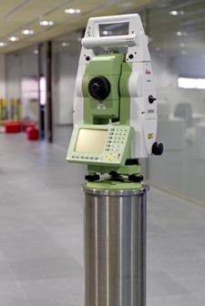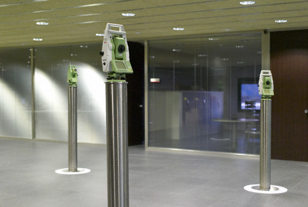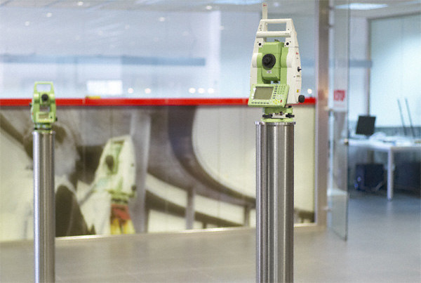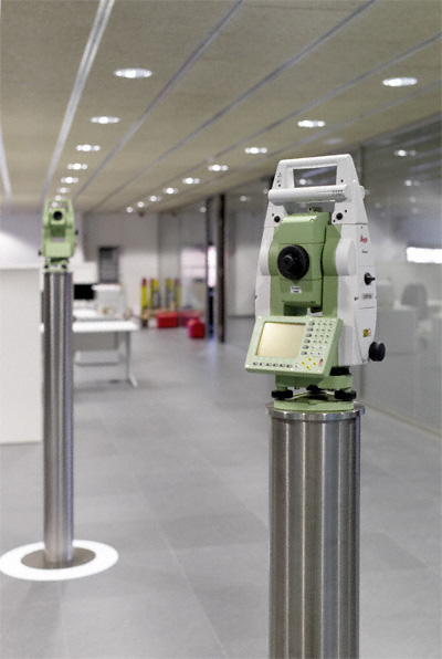 Columnas para exhibición de maquinaria, columna en acero inoxidable con cabezal mecanizado y pie de acero pintado. Puede realizarse con el pie en acero inoxidable.