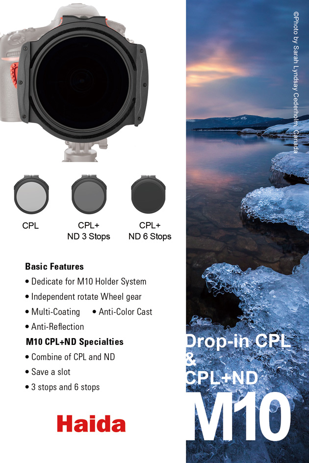 El nuevo portafiltros M10 permite el uso de filtros encapsulados mas fáciles de colocar que los tradicionales. Si va a usar un filtro por ejemplo de 10 pasos esto le permitirá encuadrar y en el momento idóneo colocar el filtro en unos instantes. Adicionalmente u construcción se ha realizado para minimizar las posibles fugas de luz. Hay filtros CPL, ND de 3 a 15 pasos, mixtos ND+CPL de 3 y 6 pasos, filtro anti contaminación luminica y por último filtros GND de 3 pasos. En los modelos CPL, ND+CPL y GND el filtro dispone de una pequeña ruedecita para mover la posición.