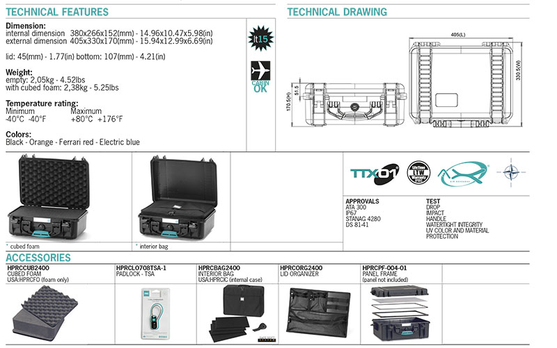 Significa que las maletas HPRC puede soportar impactos, caídas, presiones, humedad, polvo, arena y ácidos desde -40 ° C to️ hasta + 80 ° C