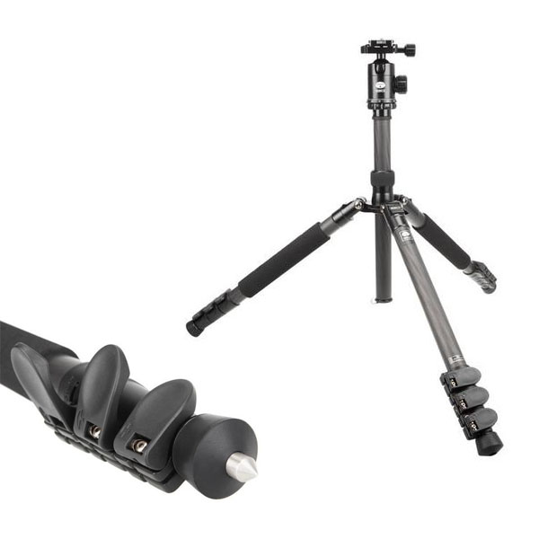 La rótula puede permanecer en el trípode. Cada pata está formada por 4 secciones con 3 cierres de seguridad. Los pies de goma aseguran que el trípode se mantenga firme y estable en todas la superficies.