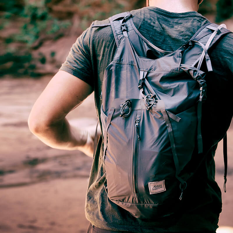 Su diseño compacto permite doblar la mochila hasta el tamaño de una botella de agua. Se proporciona una bolsa de almacenamiento acoplable para la bolsa de agua Hydrolite.