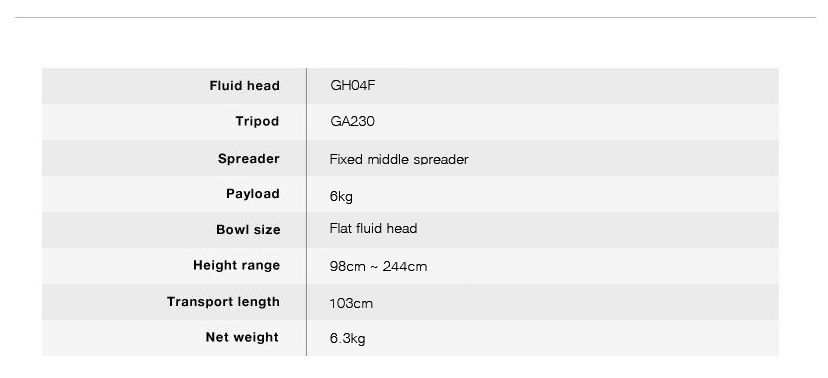 El kit de trípode E-Image EG03FA3 tiene una carga útil de 5 kg y un rango de altura de 97 cm a 243 cm. El kit EG03FA3 incluye la cabeza de fluido GH03F, el trípode GA230 y un esparcidor intermedio fijo.