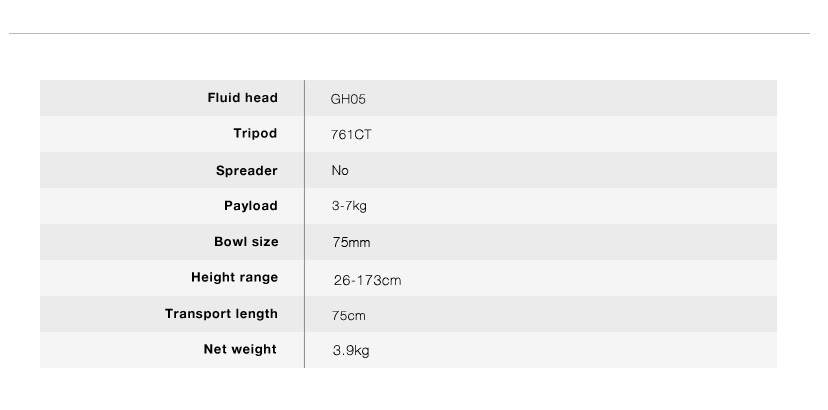 Se puede lograr un excelente equilibrio de la cámara gracias a la función de contrapeso con el resorte incorporado. El sistema de torsión fluida contribuye a un funcionamiento suave. Su carga máxima es de 3 a 7 kg. La altura máxima es de 173 cm, la altura mínima es de 26 cm, la longitud de transporte es de 75 cm y el peso neto es de solo 3,9 kg. El GH05+761CT es un sistema de trípode básico ideal para grabaciones de vídeos domésticos. y para usuarios de cámaras réflex digitales de objetivo único.