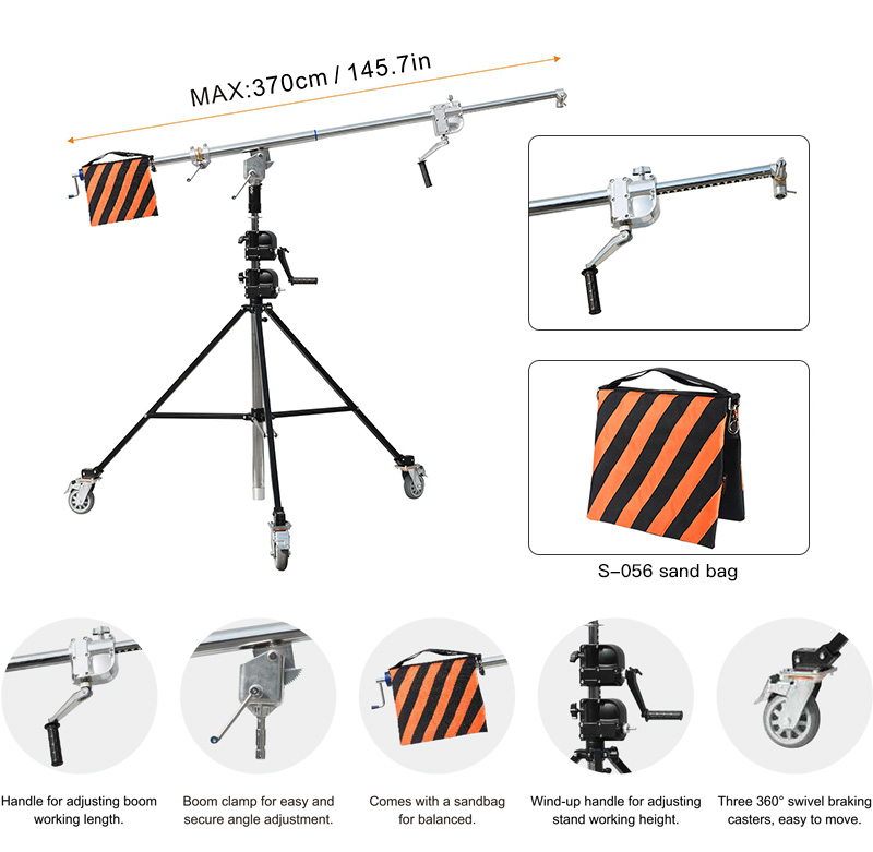 E-IMAGE HSB300 soporte resistente de elevación con manivela, brazo de extensión y ruedas con freno emplea tres ruedas con freno para movimientos de giro de 360°. La sección del soporte soporta cargas de luminarias de hasta 66.1 lbs (30 kg), con una altura máxima de 155.5 pulgadas (3.95 m). La columna engranada y la manivela proporcionan una elevación asistida mecánicamente. El brazo de extensión, hecho de acero, se extiende hasta 3.7 m.