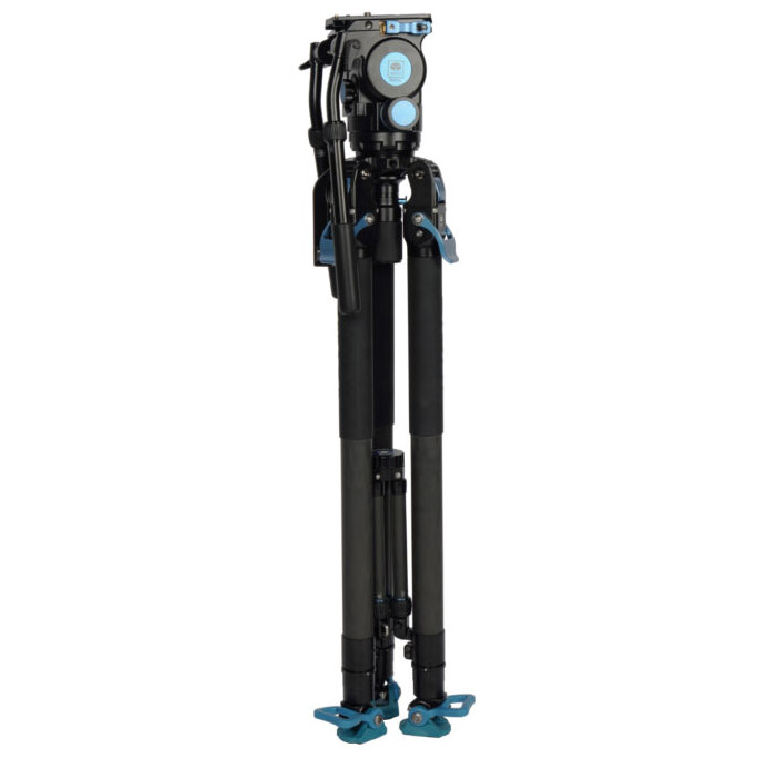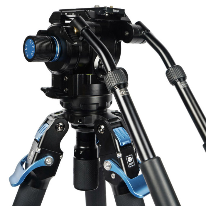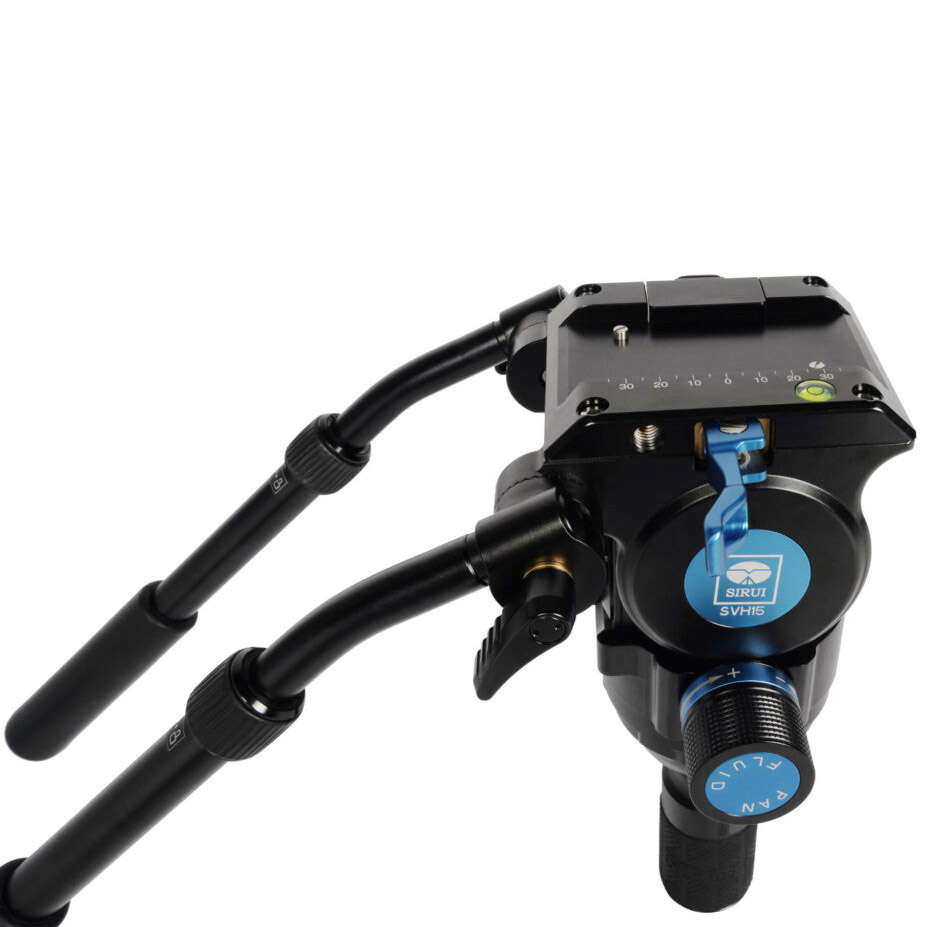 El trípode de vídeo SVT75 Rapid System One-Step Height Adjustment con cabezal de vídeo SVH15 de control de arrastre y asa de liberación rápida de 75 mm en forma de media esfera.